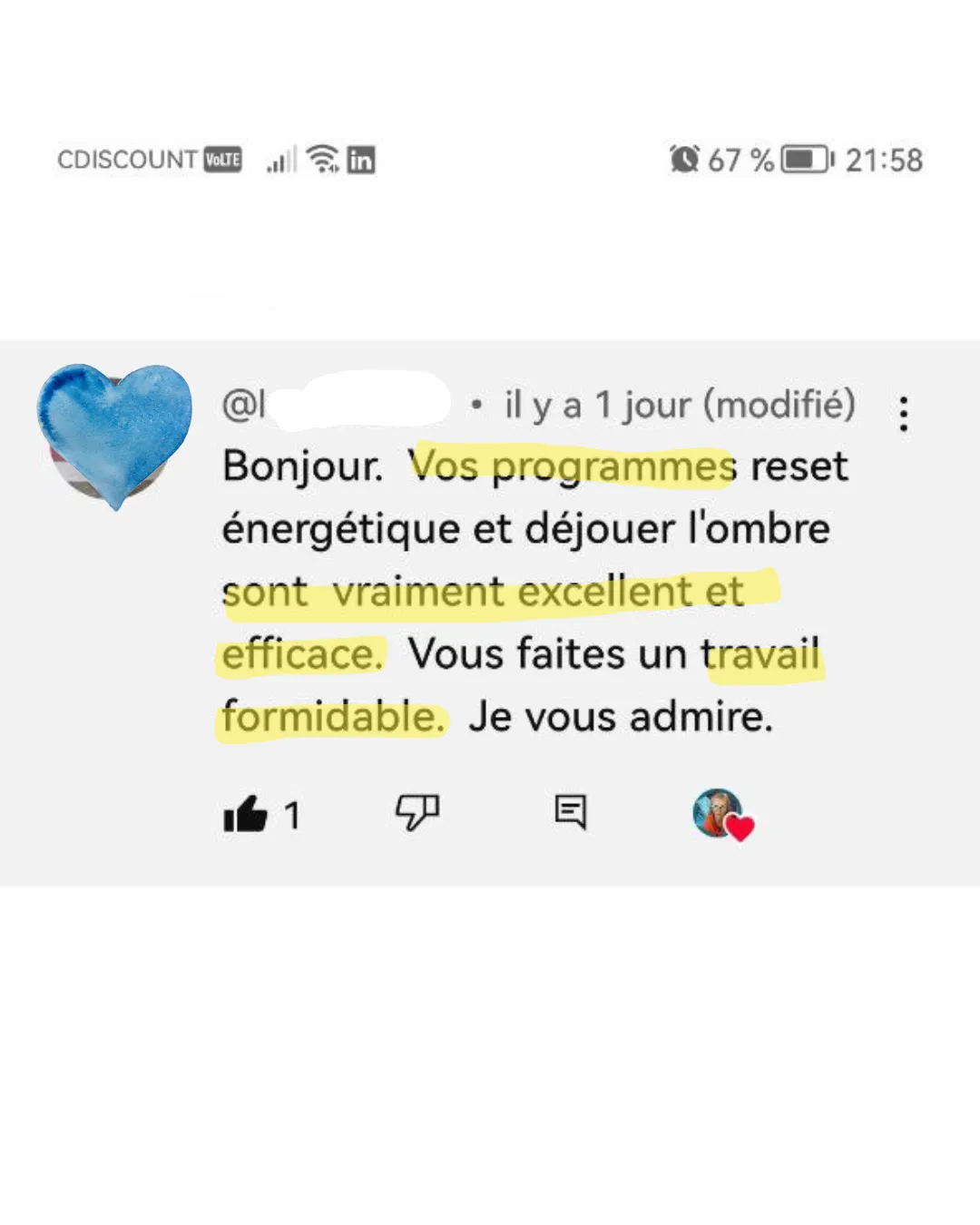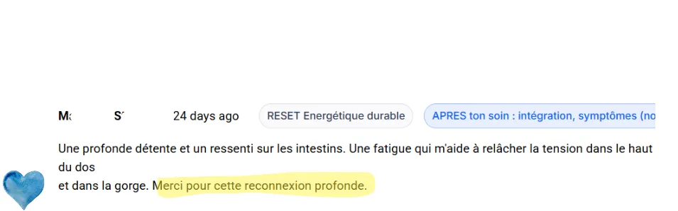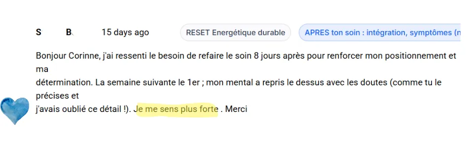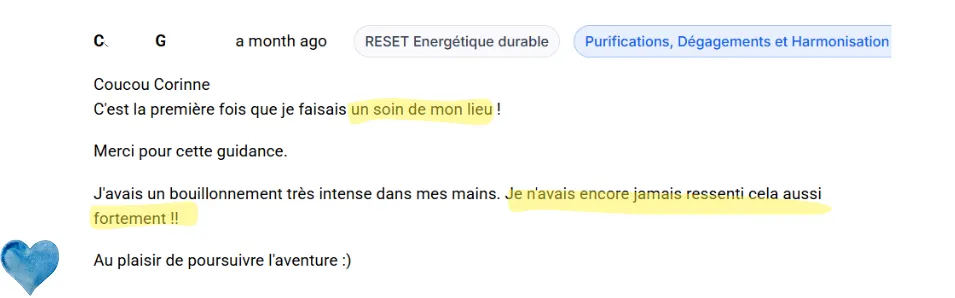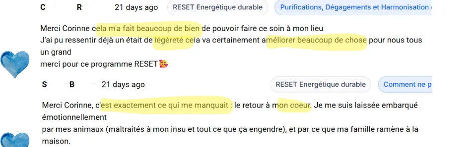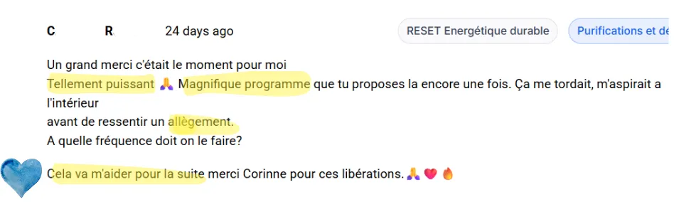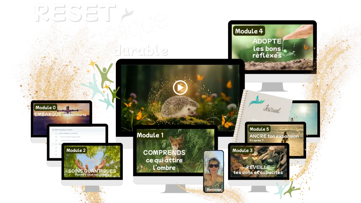 Mais un vrai reset énergétique : des compréhensions profondes, qui allie des soins quantiques puissants, et des enseignements authentiques pour te permettre de changer de niveau de conscience — pour, ensuite, que tes nettoyages tiennent et surtout, repousser naturellement les pollutions.
